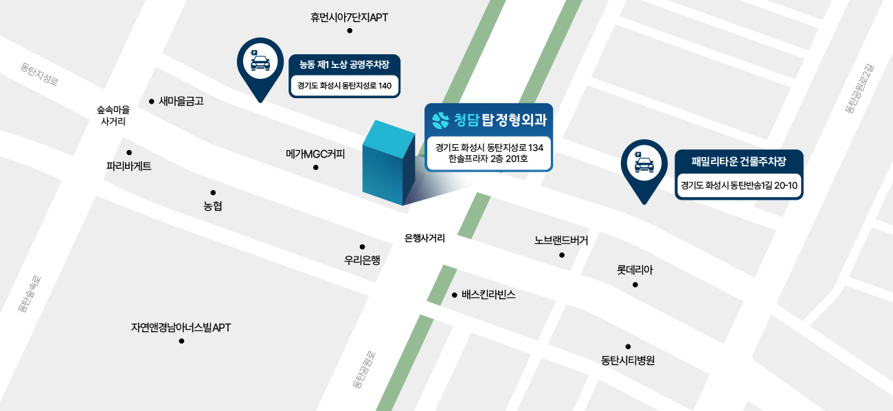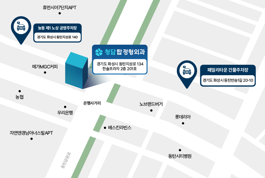 청담탑정형외과 동탄점은 1동탄(서동탄) 능동 은행사거리, 우리은행 맞은편에 위치하고 있습니다.